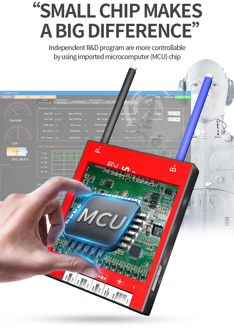 balancing function. The circuit is simple and reliable - Strong load ability, high constant discharge current, using high voltage tolerant and ultra low resistance power MOSFETs. Daly's extra large heat sinks and sealed thermal coating greatly assist cooling