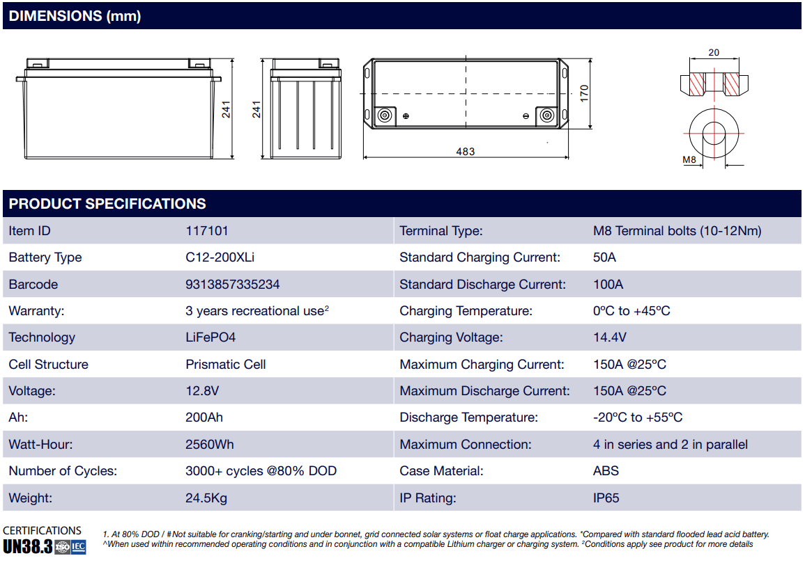 1At 80% DOD / #Not suitable for cranking/starting and under bonnet, grid connected solar systems or float charge applications.