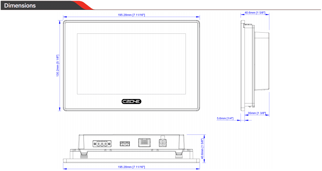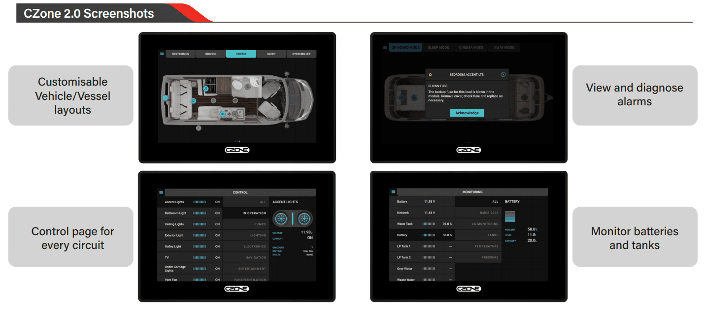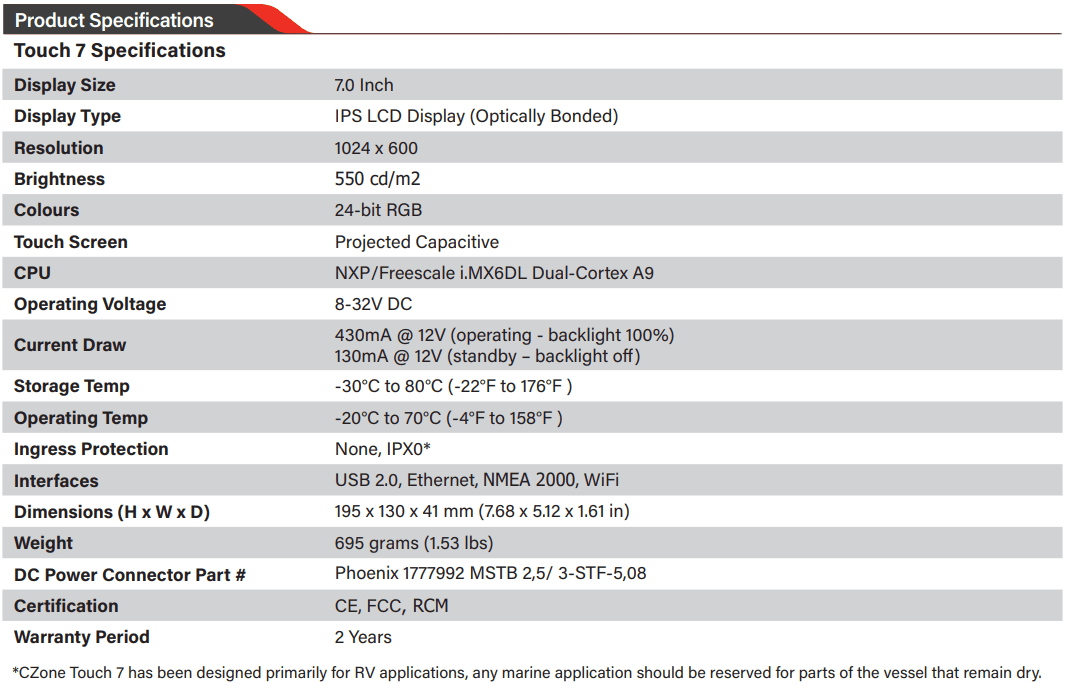 Introducing the CZone Touch 7. With an excellence 7" IPS LCD panel it can be viewed from any angle. The Touch 7 features all new electronics with the fastest dual core processor ever in a CZone Touch display and built in Wi-Fi connectivity and Ethernet for tablet pairing. Installation is easy with front mount installation and screwless rear access, shallow 35mm mounting depths (including cable) and a wide 8-32V DC voltage range. The Touch 7 also uses the familiar and easy to use CZone 2.0 User Interface, customizable for any OEM. The Touch 7 is primarily designed for RV applications, and any marine application should be reserved for parts of the vessel that remain dry.