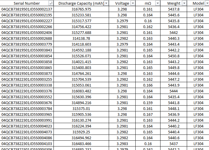 Factory test report for each cell available, typical cell capacity is 315Ah.