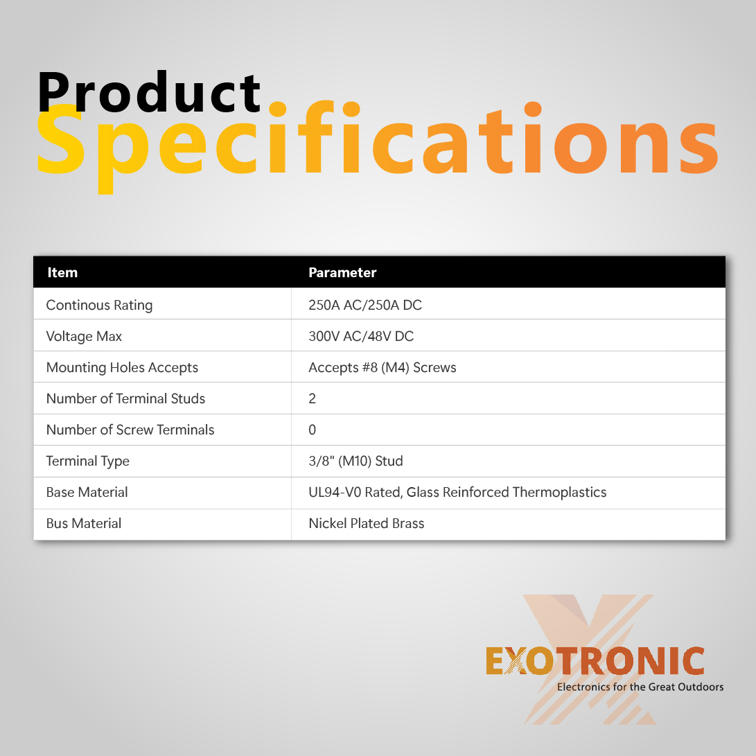 Whether you’re building a comprehensive battery management system, configuring a marine-grade electrical setup, or optimizing power distribution in renewable energy systems, the Exotronic 250A busbar delivers the durability and performance you need. Its rugged design and premium materials make it the go-to solution for high-demand electrical installations.