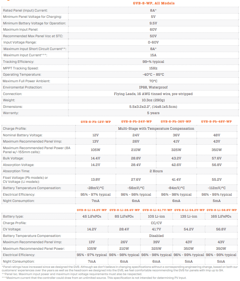 The GV-Boost Waterproof solar charge controllers carry a 5-year warranty on materials and workmanship. Genasun's warranty does not cover damage due to abuse or operation beyond the rated specifications.