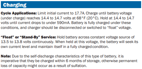 PG Series 24 months when used in standby applications 12 months when used in cyclic applications if average depth of discharge does not exceed 50% 6 months when used in mobility applications (including but not limited to wheelchair, electric scooter, pallet jack, golf buggy)