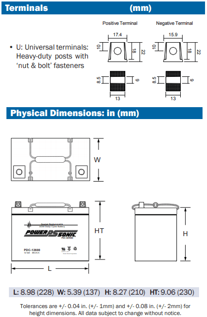 Power-Sonic deep cycle PDC range is purpose built for those applications which require regular and consistent cycling (charge and dis-charge). Commonly called deep cycling the oversized negative plates and a specialised paste formulation of the PDC can provide constant power for longer periods of time without shortening the life of the battery.