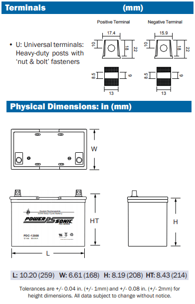 Power-Sonic deep cycle PDC range is purpose built for those applications which require regular and consistent cycling (charge and dis-charge). Commonly called deep cycling the oversized negative plates and a specialised paste formulation of the PDC can provide constant power for longer periods of time without shortening the life of the battery.