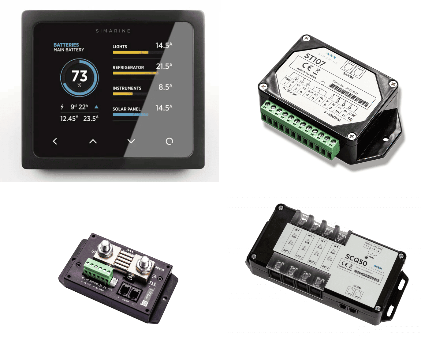 SIMARINE's advanced battery monitor for most demanding users. For up to 6 battery banks, 6 additional battery voltages, 14 tank level and 20 consumer or power generation readings. Compatible with all SIMARINE shunts and modules.