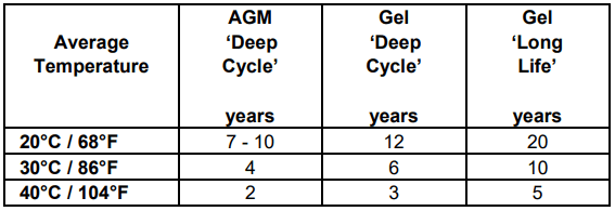 High temperature has a very negative effect on service life. The service life of Victron batteries as a function of temperature is shown in table 2.