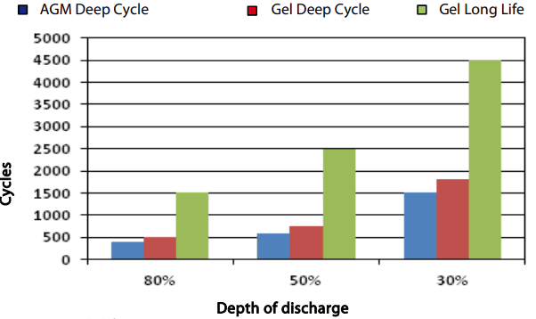Batteries age due to discharging and recharging. The number of cycles depends on the depth of discharge, as is shown in figure 2.