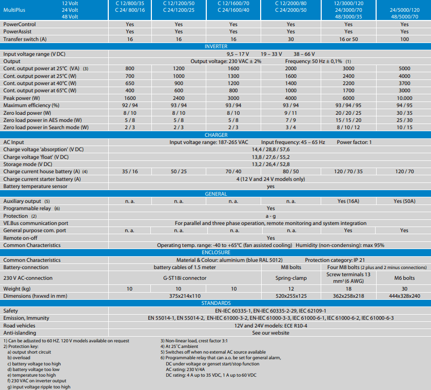 Up to 6 Multis can operate in parallel to achieve higher power output. Six 24/5000/120 units, for example, will provide 25 kW / 30 kVA output power with 720 Amps charging capacity.