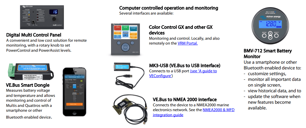 Several options are available: Battery Monitor, Multi Control Panel, Color Control GX or other GX devices, smartphone or tablet (Bluetooth Smart), laptop or computer (USB or RS232).