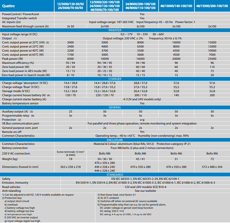 Designed for easy integration with solar PV and other renewable energy systems, the Quattro enhances your ability to maintain a sustainable and eco-friendly lifestyle. Enjoy the benefits of clean energy while ensuring that AC power is available, even during grid failures, for a truly autonomous living experience.