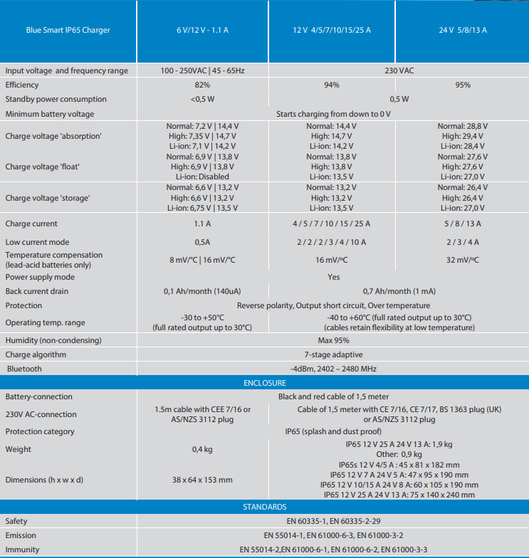 | Model | Blue Smart IP65 Battery Charger 6V/12V - 1.1 A |