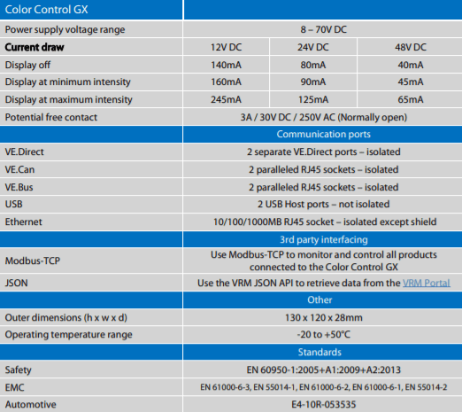 The Color Control (CCGX) provides intuitive control and monitoring for all Victron power systems. The list of Victron products that can be connected is endless: Inverters, Multis, Quattros, MPPT solar chargers, BMV battery monitors, Lynx Ion + Shunt and more.