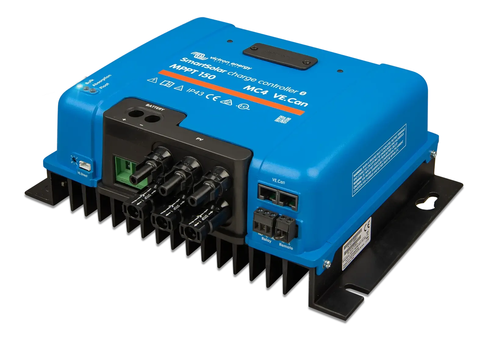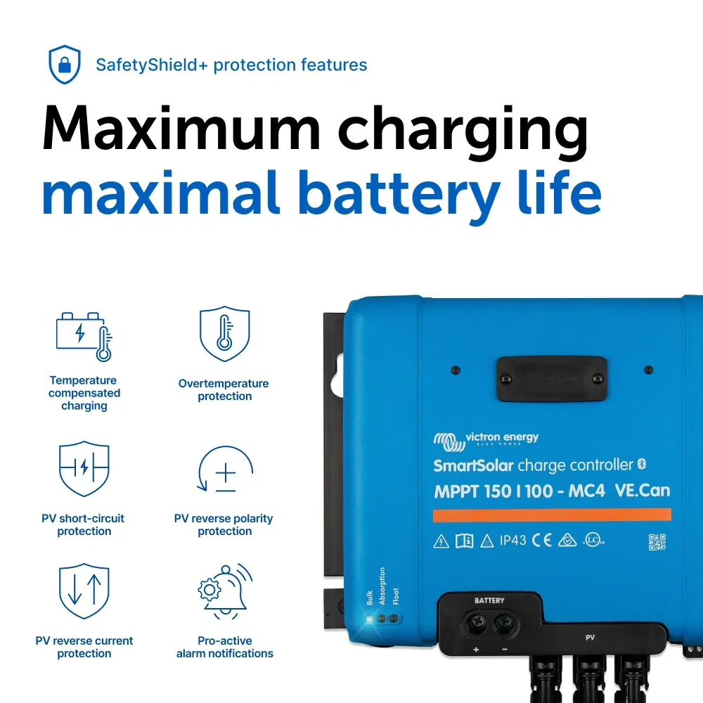 Engineered with extensive electronic protections, this controller safeguards against PV short circuits, reverse polarity, and reverse current. Its intelligent thermal management includes power derating and over-temperature protection, ensuring safe operation in extreme conditions. Additional features such as a programmable relay, remote on/off capability, and compatibility with VE.BUS BMS systems extend the controller’s functionality for complex solar arrays and lithium battery systems.